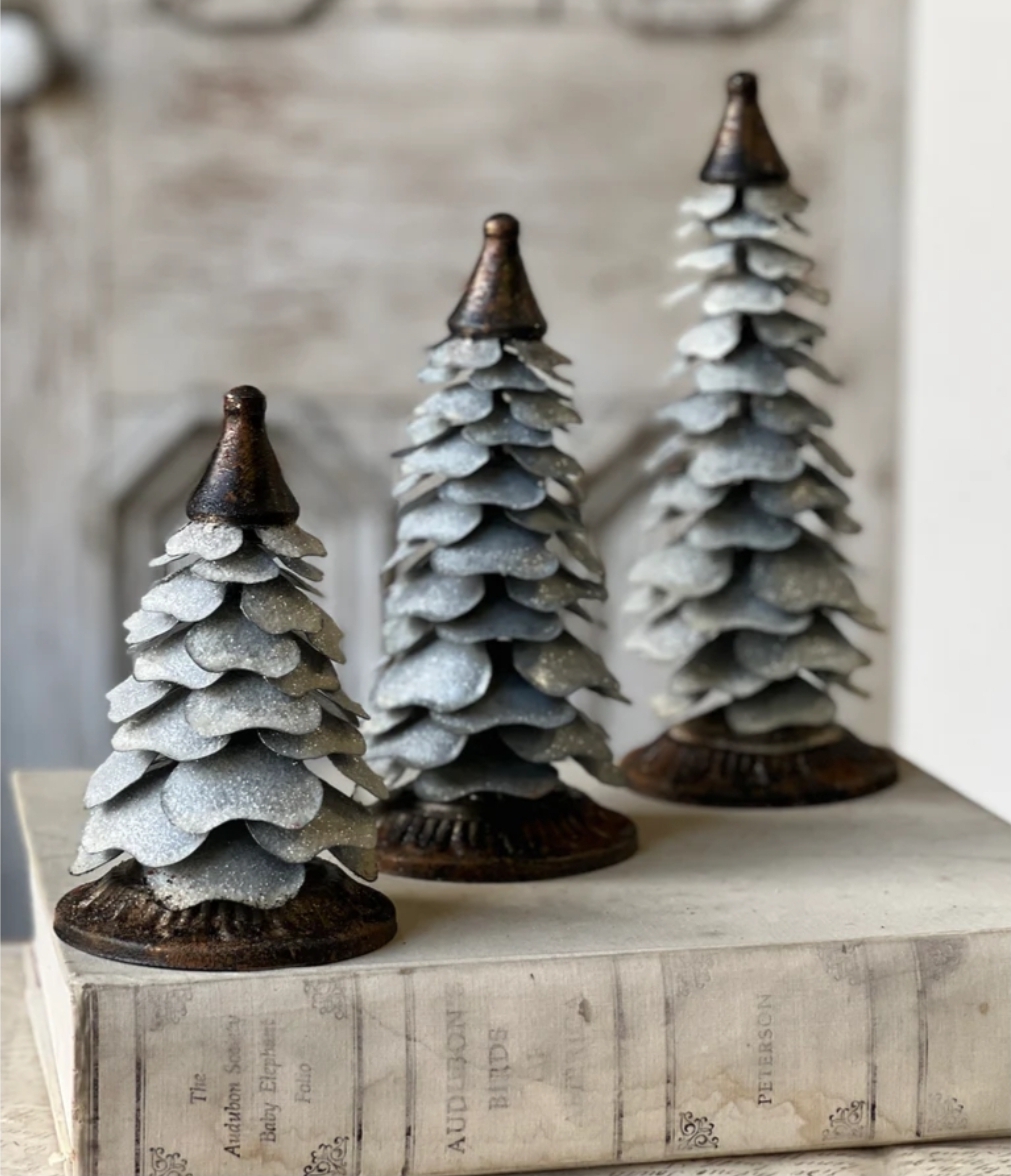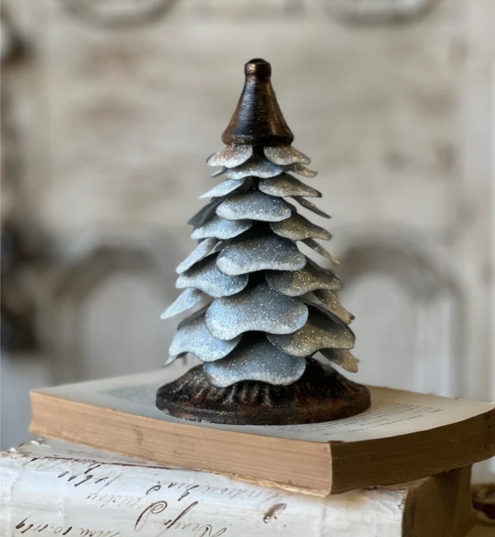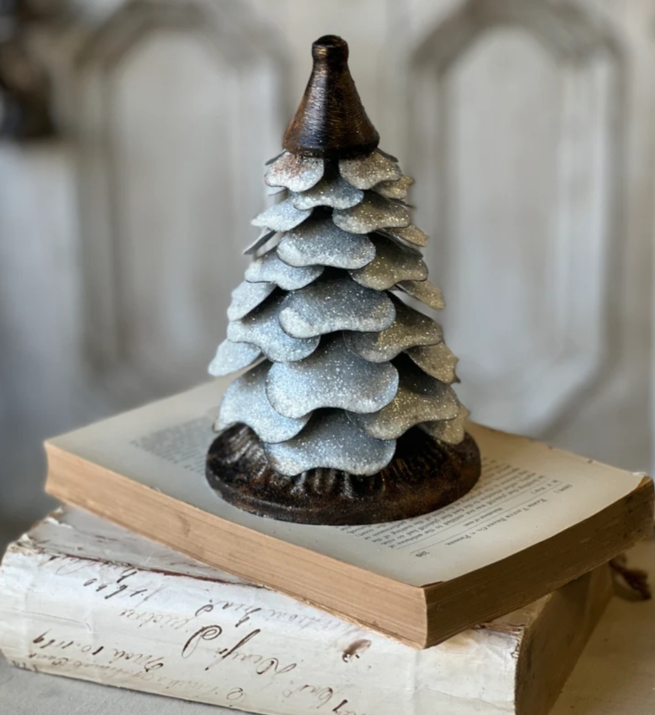 A delicate play of glow and contrast, our Frosted Scallop Pine is dressed in softly snowy boughs and brushed with a subtle iridescent shimmer that catches the light just so. Its darker, weathered base grounds the design with a touch of heirloom character — making it feel both enchanting and timeless.