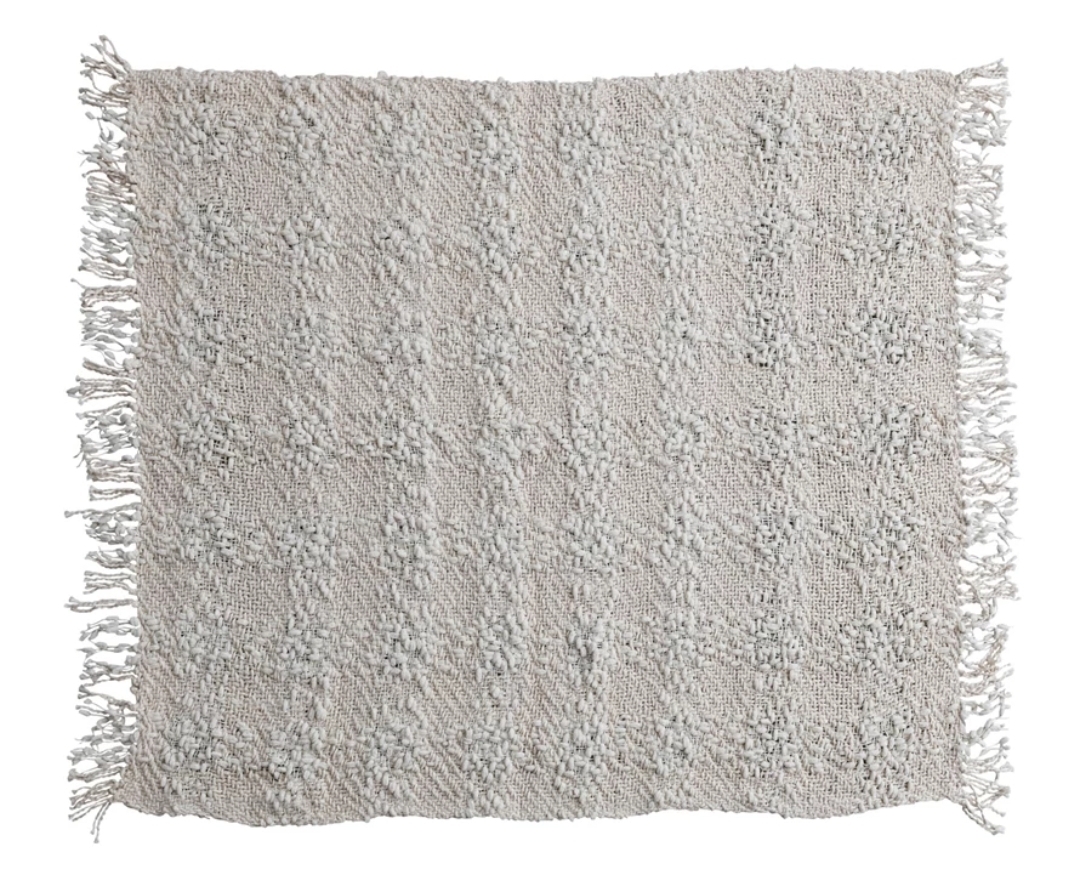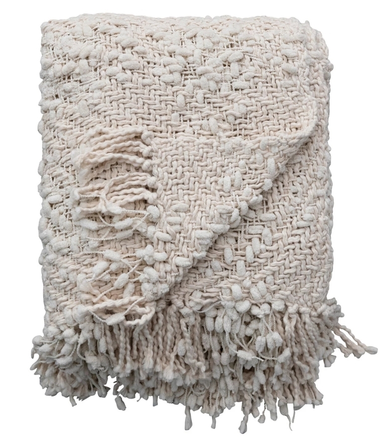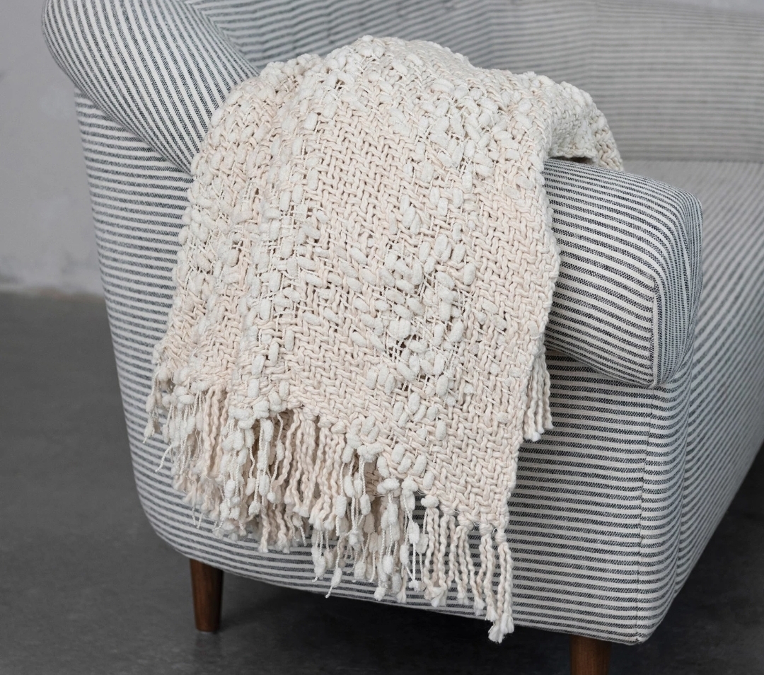 Softly woven from a cozy cotton blend, the Thistledown Knit Throw brings gentle texture and warmth to any setting. Its natural hue and handwoven cable-inspired pattern evoke the charm of heirloom textiles, while the fringed edges add a touch of relaxed refinement. Measuring 60″L x 50″W, it’s the perfect layer for draping over a favorite chair, adding depth to a sofa, or curling up with on a quiet evening. A timeless accent that feels as comforting as it looks.